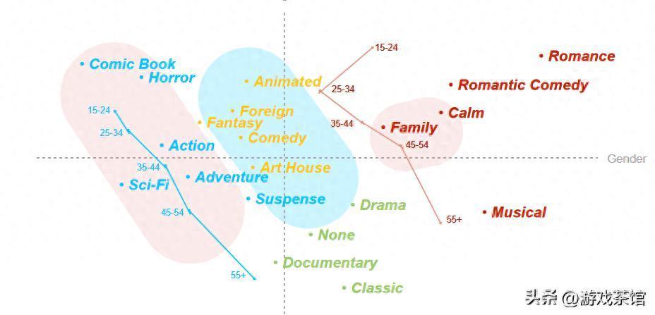 这张图来自英国电影行业,横纵轴分别是性别和年龄,对应不同情感需求的影视类型散布其上。